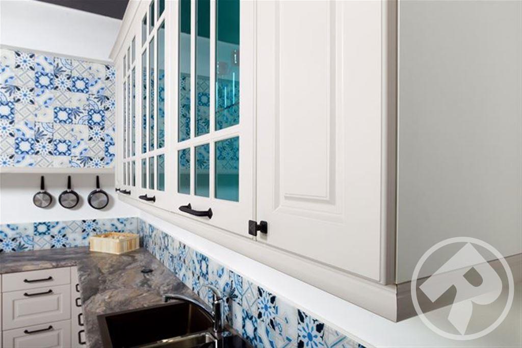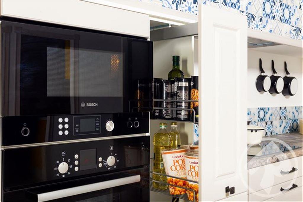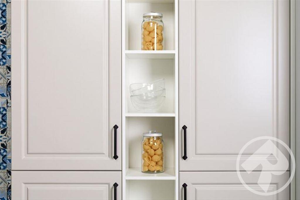 Оцените удобство высоко расположенной духовки и вместительных выдвижных ящиков с идеальной организацией внутреннего пространства. Изящные рамочные фасады из стекла придают кухне прозрачность и глубину.
