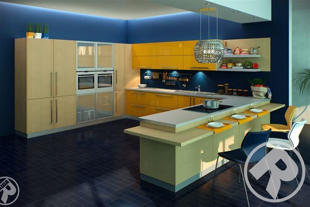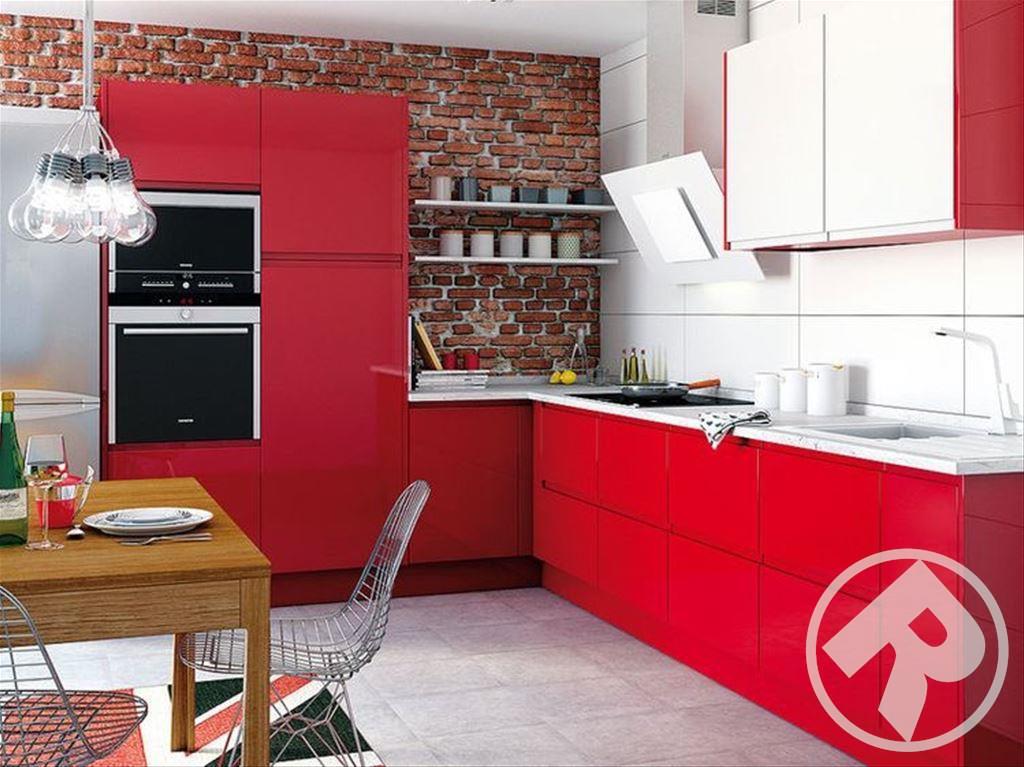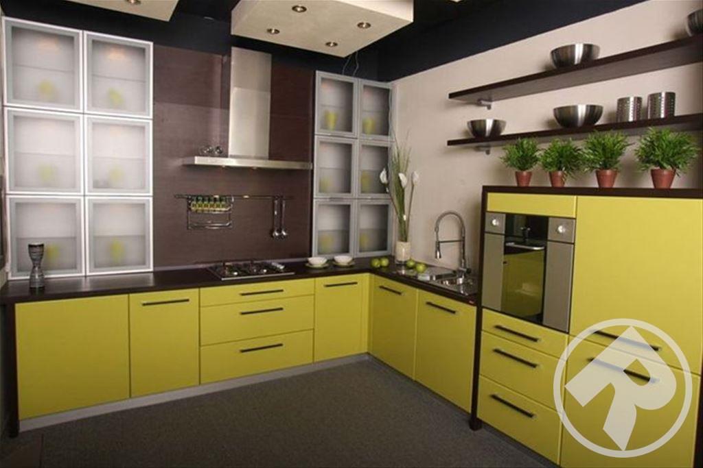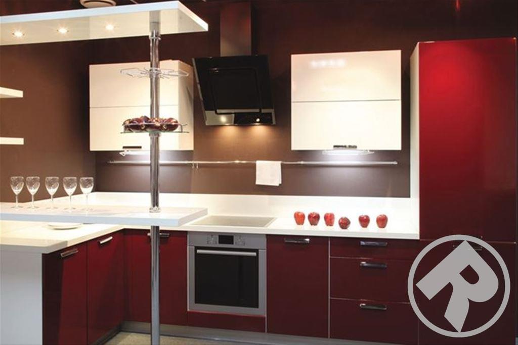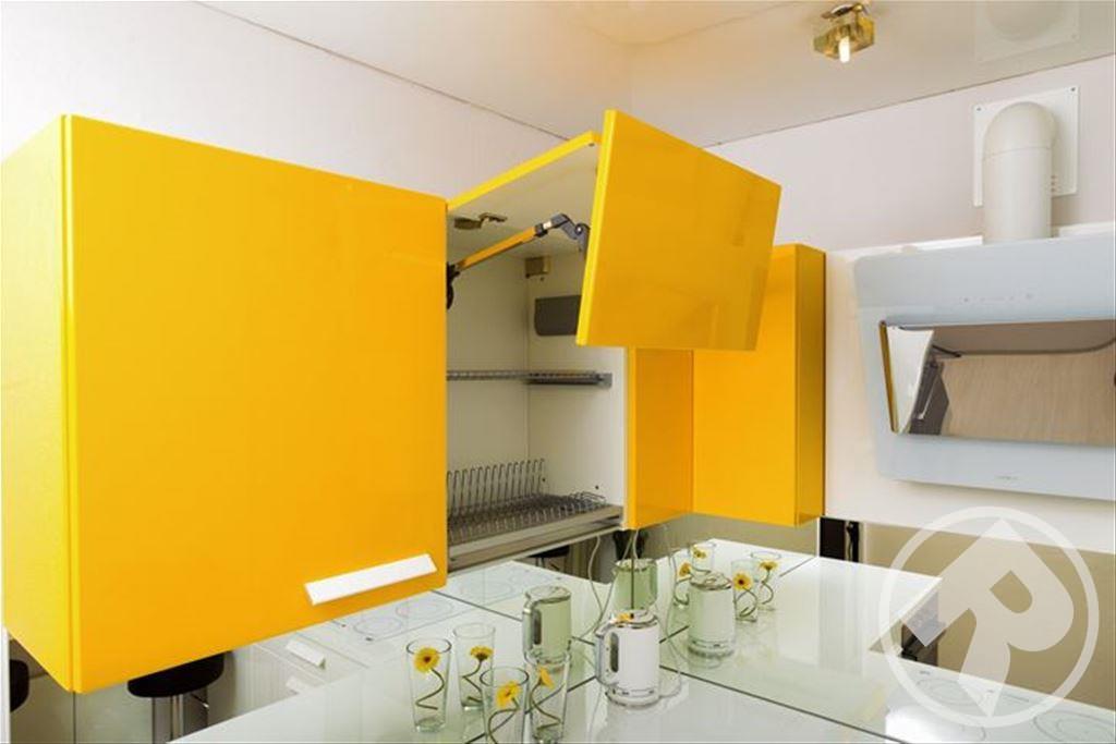 Весь корпус гарнитура выполнен из ЛДСП, фасад из экологичного МДФ со слегка закругленными торцами, в качестве облицовки идет глянцевая пленка ПВХ. Витрины с элементами стекла придадут некоторую оживленность интерьеру. Их можно дополнительно включить в кухню на заказ.